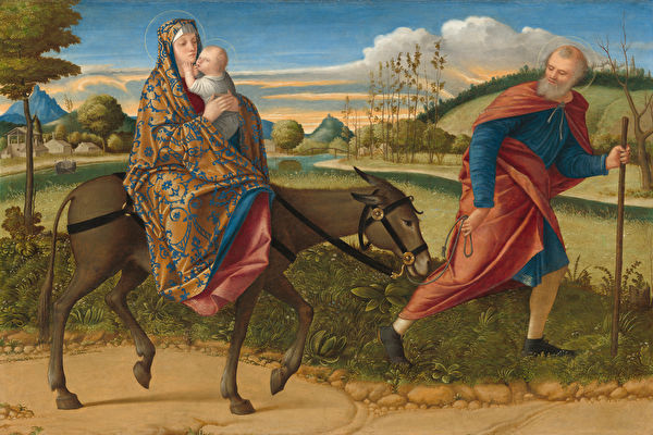 当时罗马帝国举行户口大普查,按照法令,约瑟必须回出生地,即犹太的伯利恒登记户口。马利亚产期已近,行动不便,但还是跟随丈夫,一起越过河谷、沙漠,走了十天,艰难跋涉了150公里,才到达了伯利恒。