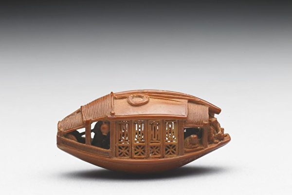 据康熙年间钮琇所著《物觚》介绍,康熙一朝,姑苏有一金姓老匠人,雕刻手艺堪称一绝。他能在一枚桃核上,雕镂出一艘“东坡游舫”:舫上高大隆起,舫下宽敞而平坦,中间是方形船舱,船舱四周雕饰著美丽的花纹。两侧各有一扇小窗,开合自如。打开小窗,看里面还陈列著一桌几,三把椅。中间所坐之人正是苏东坡,佛印禅师则坐在东坡的对面,里面还有一个吹箫的少年。