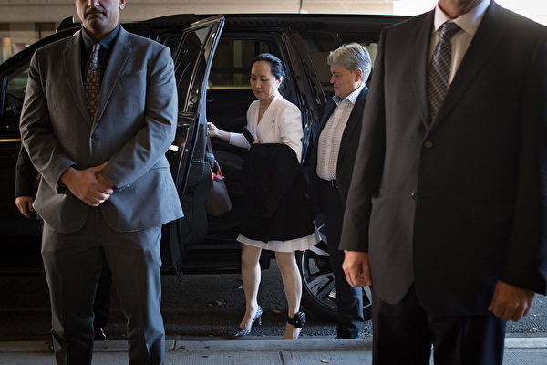 孟晚舟前往法庭接受聆讯时,脚腕上戴着跟踪设备——电子脚镣。