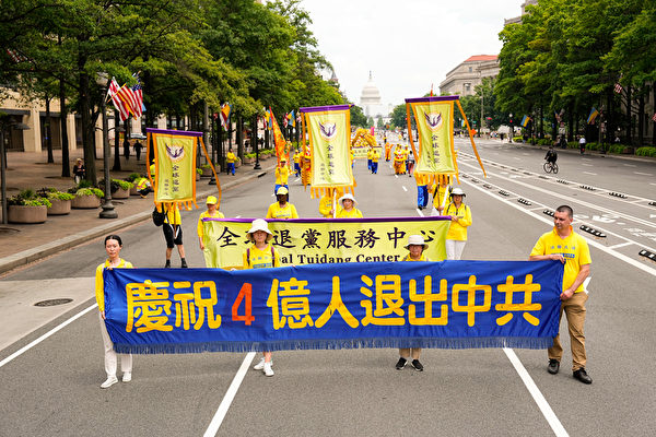 最后是三退(退党、退团、退队)方阵。自“九评共产党”2004年发表之后,掀起了三退(退党、退团、退队)大潮,迄今约四亿人退出中共组织,法轮功学员庆祝越来越多的中国人觉醒,抛弃共产党走向光明。