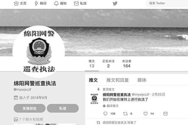 【大纪元2019年03月04日讯】(大纪元记者易如、凌云综合报导)近日,有网友发现,一个注册信息是“绵阳网警巡查执法”的推特账号宣称在推特上进行“执法”。网民斥责说,“狗都跑外面来了?”也有网民表示已经向美国政府举报。