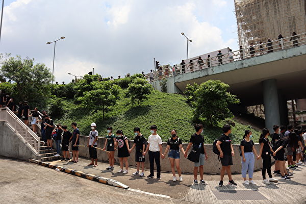 【大纪元2019年09月09日讯】(大纪元记者骆亚香港采访报导)9月9日中午,香港城市大学和浸会大学的学生从各自校园内开始组人链,并以“歌和老街”(两校之间的马路名)作为连结段,绵延几公里,场景非常壮观。学生们表示,这是对表达反送中,坚持五大诉求的支持。