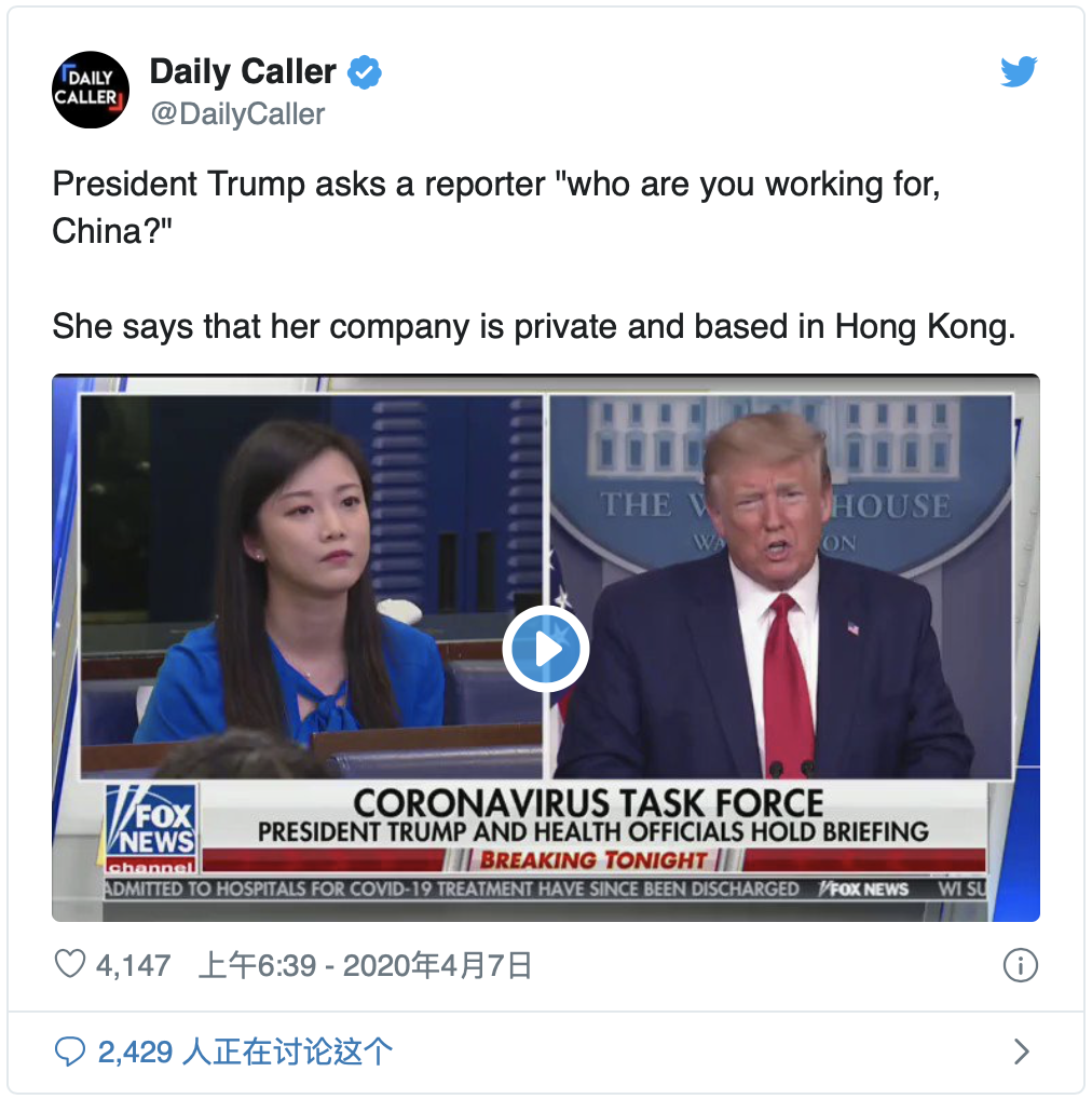 在4月6日的白宫疫情简报会上,凤凰卫视的女记者王又又提问时表现极不专业,被特朗普追问 “你替谁工作?中国吗?”在听说她在为香港凤凰卫视工作后,特朗普又追问:“谁拥有它?中国?” “是国营的吗?”都被王又又否认。不少华语网友称赞特朗普直觉敏锐,有人发推说:“凤凰卫视人称香港央视,百分之百的中共媒体。”
