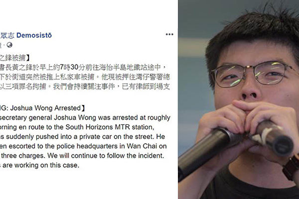 香港众志在社交网站上贴文表示,黄之锋早上约7时30分前往港铁海怡半岛站的途中,在众目睽睽下于街道突然被推上私家车被捕,现被押往湾仔警署总部。据闻警方共以三项罪名拘捕了他。