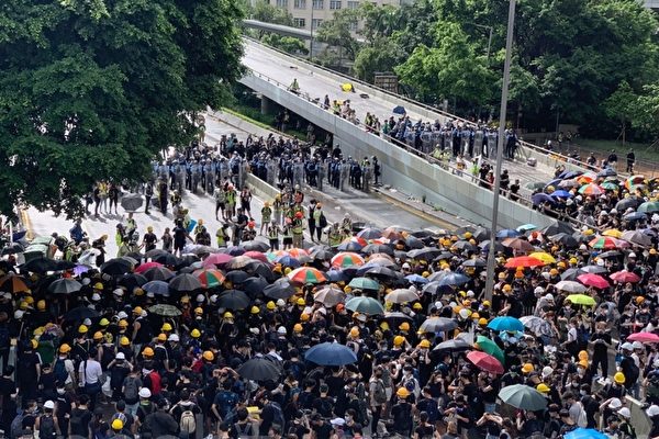 图为2019年7月1日,香港大批民众一早就聚集在夏悫道,与警察对峙。(李逸/大纪元)