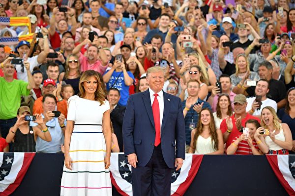 川普和第一夫人梅拉妮亚抵达演讲现场 。