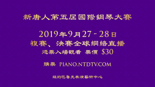 【大纪元2019年09月27日讯】新唐人第五届国际“钢琴大赛”是新唐人电视台全球系列比赛之一,其宗旨是弘扬古典艺术和传统文化,弘扬纯真、纯善、纯美的正统艺术,重现巴洛克、古典直至浪漫主义时期钢琴音乐的华彩乐章。