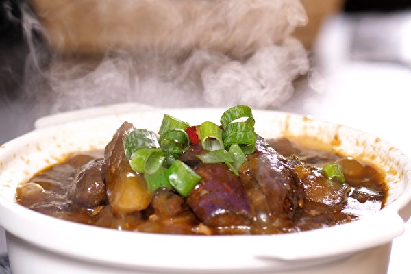 11. 將茄子放入燒熱的砂鍋中燉煮,最後加蔥粒。