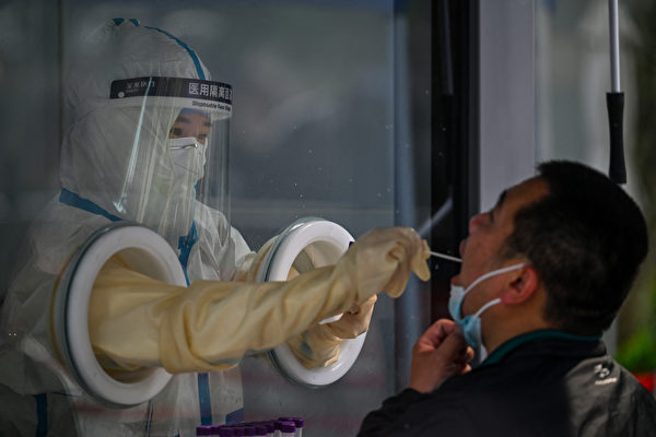 中共官方决定多地实施常态化检测,建立“15分钟核酸检测圈”。图为2022年5月27日上海街头实施检体采样。(Hector Retamal / AFP)
