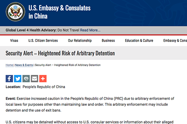 声明还说,美国公民可能在中国被拘留,且无法跟美国领事服务处取得联系,或美国领事服务处无法获知当事人被指控的犯罪信息;美国公民可能会因与中共声称的“国家安全”原因、受到长期讯问和长期拘留;美国公民因发送批评中国(中共)政府的私人电子邮件,可能被中共安全人员拘留和/或驱逐。