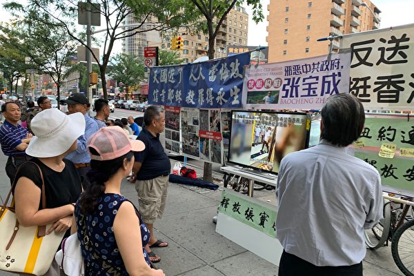 在纽约缅街,组织者架起电视机播放录像、拉起图片展,传递真相,对港人表达支持,并让过路的民众了解港人向中共说“不”的强烈诉求。