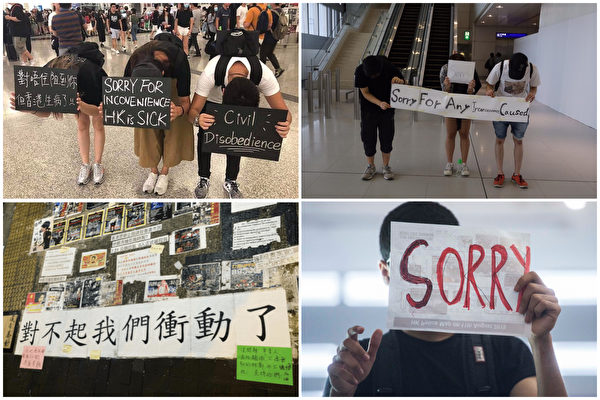 8月14日,一些年轻的抗议者到机场深度鞠躬、举牌向旅客致歉。社群平台脸书也流传几张被制成图片的香港示威者道歉声明。