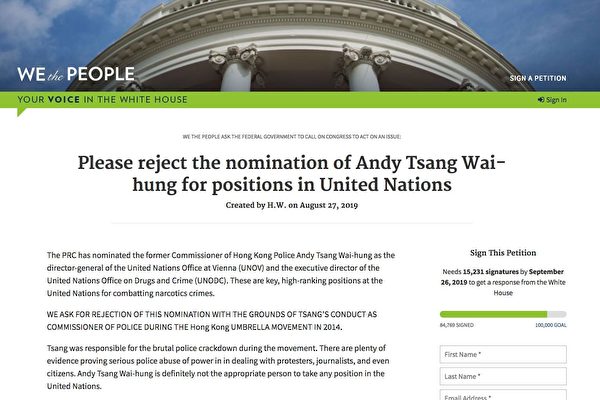 一位署名“H.W.”的民众于8月27日在“我们人民”网站上,以“请求拒绝提名曾伟雄担任联合国职位”(Please reject the nomination of Andy Tsang Wai-hung for positions in United Nations)为题发起一项请愿活动。