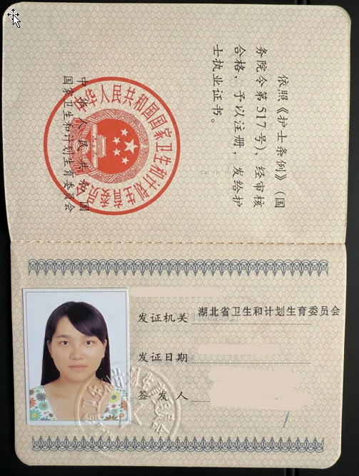 张宇在武汉某三甲级医院当护士时的护士职业资格证。(受访者提供)