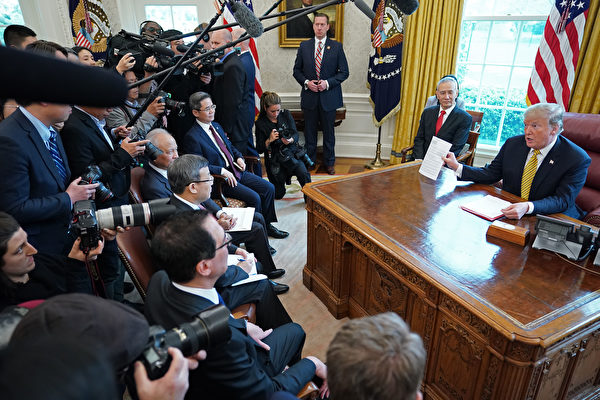 当天,他还告诉记者,双方在讨论知识产权保护与盗窃以及关税等两大有待解决的艰艰问题。在记者离开后,特朗普直接与刘鹤讨论关税等重大问题。