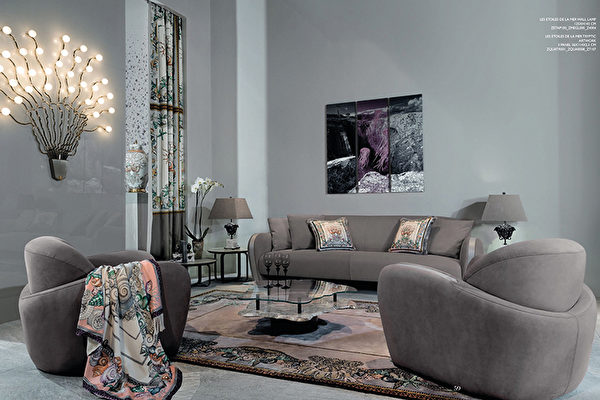 VERSACE家具是意大利奢侈品之一,突出时尚的同时, 在现代家居室内设计和高端家具中,皆引入了怀旧的古典元素,如改良的屏风隔断既起到分隔与装饰的作用,又是整个空间的亮点。家居一方面搭配极具现代气息的初级灰软装,以软硬的平衡,自在显露当今的时代感,一方面背景墙却以两幅清墨淡彩画作为点睛之笔,使整个空间极富时尚气息的同时,又不失典雅的艺术氛围。