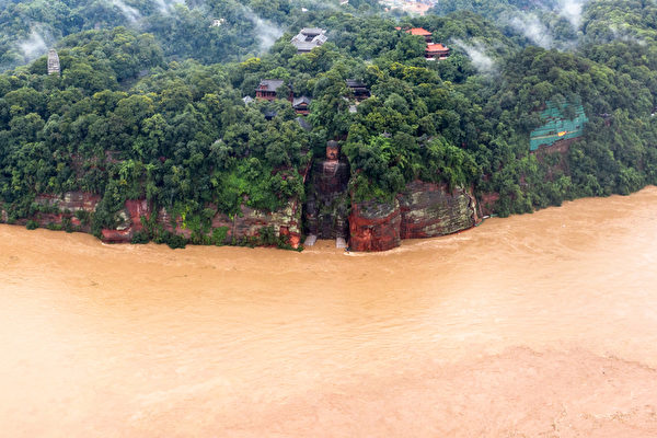 乐山大佛佛脚平台被淹约2.5米,洪水淹过大佛脚底。当地民谚:“大佛洗脚天下乱”!看《烧饼歌》预示乱世出路。(STR/AFP)