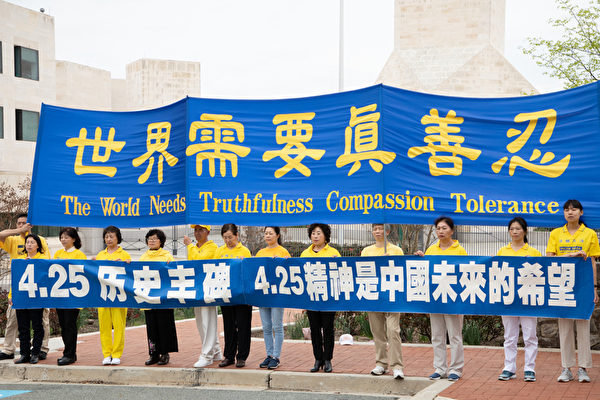 4月14日下午,美国首都华盛顿地区的部分法轮功学员在中共驻美大使馆外集会,纪念425和平上访二十周年。曾经参与425事件和见证中共造假的法轮功学员在现场发言,以亲身经历揭露中共迫害,呼唤中国社会重拾良知与道德,停止迫害法轮功。