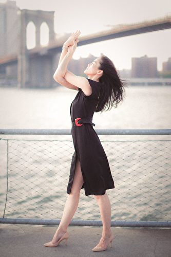 2、接下来用力往上伸展,同时将双脚脚跟抬高,臀部用力紧缩,脸部朝天花板抬高,有意识地将背部、腰部、大腿后侧伸展开来。维持5秒钟。