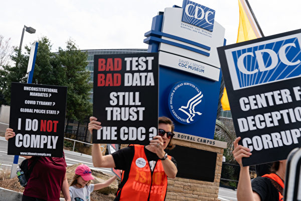2021年3月13日,乔治亚州亚特兰大,美国疾病预防与控制中心(CDC)总部外,人们在抗议口罩、疫苗和疫苗护照等强制命令。(Elijah Nouvelage/Getty Images)