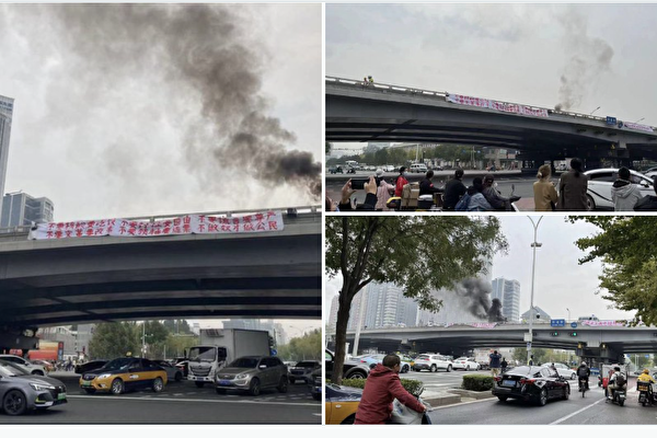 本周日(16日)中共即将于北京召开二十大。但是周四(13日)上午,网传照片显示,在北京海淀区北三环的四通桥上,一名头戴黄色工程帽、身穿橘红色工作服的人士挂起几幅巨幅横幅。
