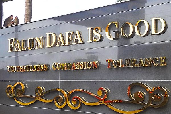 来到学校,法轮功学员就看到学校大门口处右墙上醒目的镶金英语大字“法轮大法好”和“真善忍”。