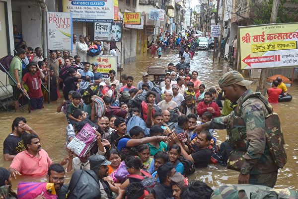 印度南部地区连日来豪雨成灾,已造成喀拉拉邦及 马哈拉施特拉邦等地数十人死亡,当局派遣军队进入灾区协助数万人撤离。(UDAY DEOLEKAR/AFP/Getty Images)