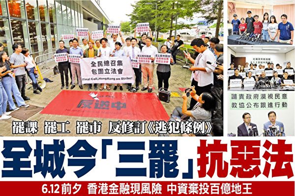 【大纪元2019年06月12日讯】(大纪元记者林怡香港报导)香港行政、立法当局无视周日过百万人游行反对修订《逃犯条例》草案,立法会12日恢复二读辩论修例。民间为表明反恶法决心,全城启动“三罢”(罢课、罢工及罢市)继续抗议。