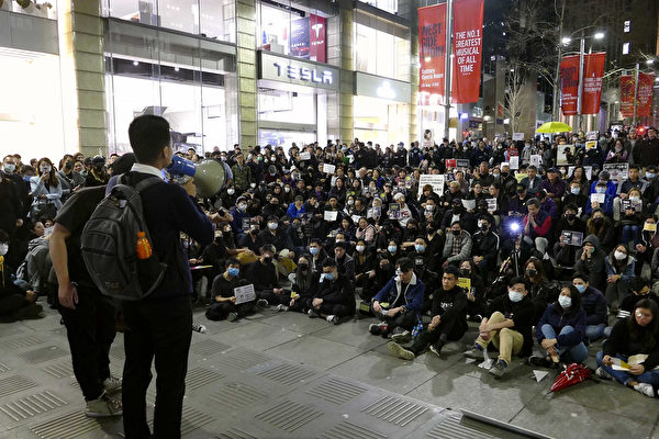 2019年8月16日,逾五百悉尼民众在市中心的马丁广场(Martin Place)静坐集会,抗议警黑暴力,声援港人。(安平雅/大纪元)