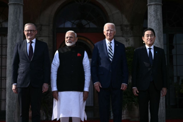 2024年9月21日,在美国特拉华州召开的四方会谈(Quad),美国总统拜登(右二)、澳洲总理阿尔巴尼斯(左一)、日本首相岸田文雄(右一)和印度总理莫迪(左二)举行会谈。(Brendan Smialowski/AFP via Getty Images)
