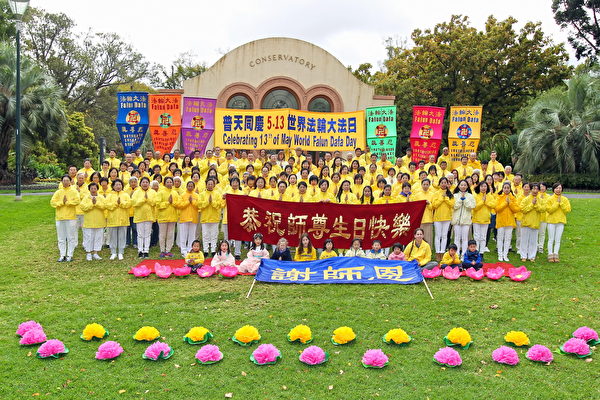活动次日(5月5日),法轮功学员们来到墨尔本市中心的费兹洛伊花园(Fitzroy Gardens)合影,恭祝师父生日快乐,感谢师父与大法给予自己的一切好运与福份。