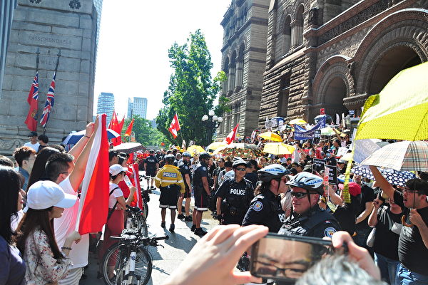 但是,以中国大陆留学生为主的华人,拿着旗子、简单的标语,甚至拿着崭新的塑料板制品,在现场近距离与参与游行的人群对峙,高声喊口号。多伦多警察不得不用单车和人墙,使两群人保持距离。