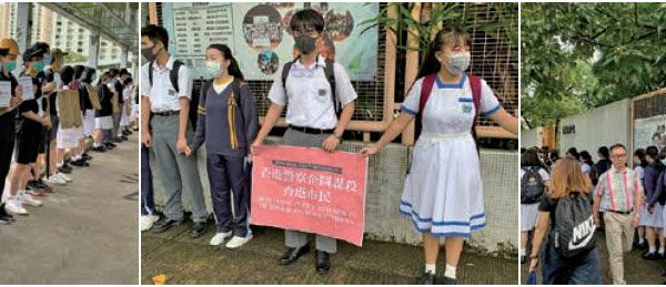 另外昨早有多间中学学生及校友,在学校附近组成人链,表达反对修例的诉求。其中在英皇书院,有大约150人参与校友发起的在校门外“接返学”活动,抗议校方拒绝让罢课的学生在校内集会,批评校方制造白色恐怖。他们并以人链表达诉求,要求校方确保学生能自由表达政治及对社会事务立场的权利。部分参加者戴上口罩,或以写着“良知”的贴纸遮盖右眼,手持“五大诉求,缺一不可”等标语牌。