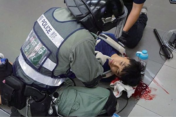 约11时44分,数名持警棍警员从B出口冲入站内,市民争相躲避,一名少年遭最少六名警员包围,其中一名警员扯住其脚,最少三名警员由上而下挥动警棍击打少年头部,其后将少年按倒在地。期间旁边的市民大叫“唔好打!唔好打!”少年双手被索带反绑躺在地上,眼神飘忽神智有点不清,头部位置慢慢渗出大片血浆。其间一名警员指骂他,不让他大叫自己的名字求援,又未马上送院治理。少年于凌晨12时半被送院。