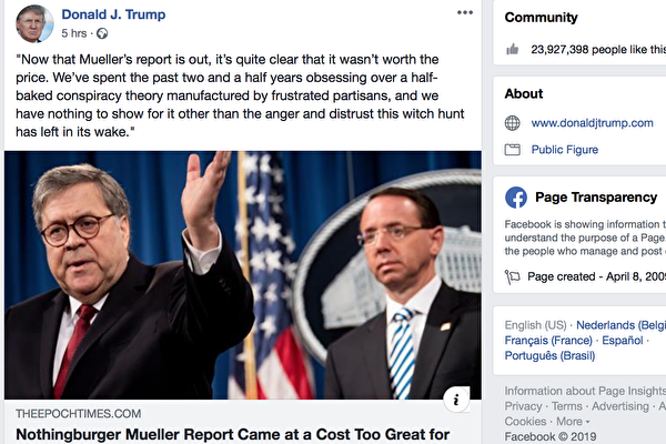 特朗普总统周六(4月20日)在其官方脸书(Facebook)账号上第五次转发了英文大纪元的专栏文章,并引述了其中的一段。