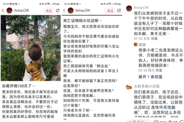 北京的一位母親「Arina ChI」因兒子甲流去世,去街道給兒子處理身後事時,發現八寶山殯儀館給的死亡證明和火化證明上死亡原因寫的是「肺出血」。她將相關信息發到網上,並質問,「可是大夫明明和媽媽說是『甲流』,原來,都不能夠留下真正死因嗎?這是禁忌?還是,你本就不是被甲流帶走?媽媽百思不得其解。」