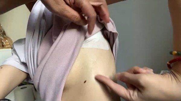 通过视频,张琦打开衣服让记者看,她胸前有从气管到腹部的手术长疤,还有一条从左胸到后背的刀痕,是她在不知情的情况下,被医生活摘了左肺;另外,她腋下赫然有一个大洞,每天必须换药清理。