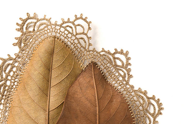 她突发奇想,将自然界中一文不名的叶子、木枝、石子与手工编织相结合,用钩针在叶子上大胆创作,除了各种几何图形,还有三维立体方块、圆柱、蛛网等造型;不起眼的天然杂物由此彰显出灵性,变身细节精微、格调静雅的艺术品。