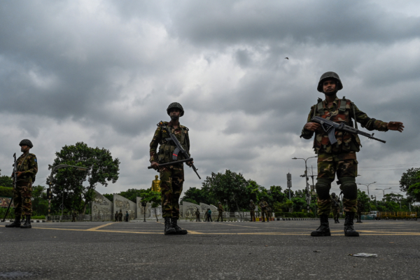 2024年7月20日,孟加拉国达卡(Dhaka),在全国各地学生示威者抗议政府工作配额的连日冲突后,士兵在宵禁和部署军队后沿街站岗。 (Munir Uz Zaman/AFP via Getty Images)