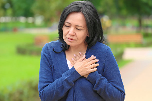 ● 觉得像有颗大石头压在胸口上,感到令人窒息的胸闷或胸痛,疼痛可能会延伸到肩膀、手上臂、颈部、喉头处或上