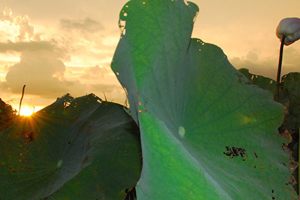 忙碌的莲田回归平静,农夫农妇回家了,蜂儿、甲虫不见了踪影,风儿还是微微来了,风儿真的关心我。我专注地、流连着远处太阳的颜色的变化,乳黄、昏黄、暗黄,还有许多幻化颜色就说不出来了。总之,太阳下山的颜色我都喜欢,甚至盼望着时间永远停止,因为这一刻的感受无限美好,此时,太阳远远地抛来一抹暖暖的残红,温馨的。当然,明天太阳还会从另一边升上来,可我想到的是,今年的莲叶伙伴们明年夏天还会来吗?