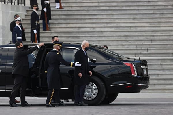 在仪式结束前,宣誓就职第46任美国总统的拜登因为疫情缩短了活动演讲。他在妻子吉尔‧拜登(Jill Biden)的陪同下,前往室内接受国会领导人的礼物。之后,拜登、贺锦丽站在外面的台阶上,正式检阅从他们身边走过的部队。