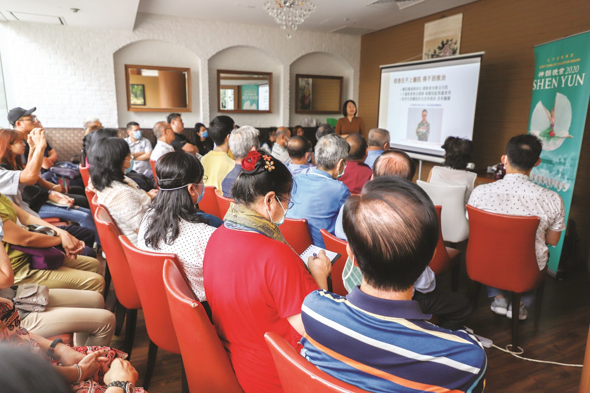 下午,位于新加坡克拉码头中心购物商场的忽必烈蒙古烤肉店内的一个房间内坐满了来参加“纪元下午茶”的听众。当天的讲座有两个话题,分别是“武汉肺炎来袭如何自救”,以及“传统文化:艺术与健康”。
