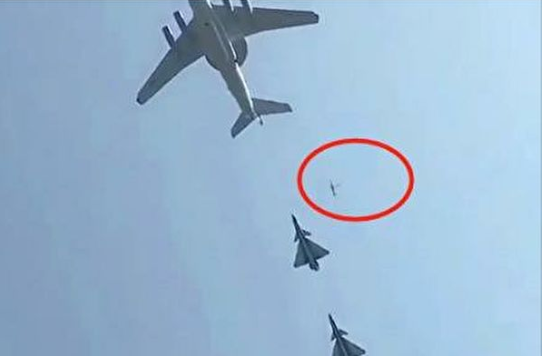 网上流传一段15秒的视频显示,中共十一阅兵中,呈箭形的空中梯队在飞行过程中疑似有物体掉落。