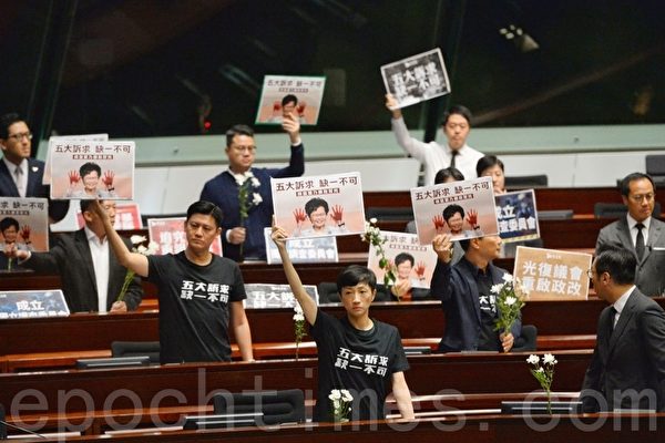 答问会开始前,17名民主派议员在会议厅外,手持白花悼念15岁遇难女生陈彦霖,并向进入会议厅的林郑月娥高呼“五大诉求、缺一不可、追究警暴、寻找真相”抗议。