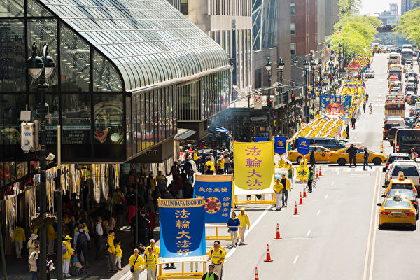 【大纪元2019年05月17日讯】(大纪元记者李桂秀纽约曼哈顿报导)周四(5月16日),盛大的近万人法轮功学员大游行在纽约曼哈顿举行,庆祝“5‧13世界法轮大法日”。气势宏伟的游行队伍绵延了几公里,震撼了整个曼哈顿,吸引了众多人群停下脚步录像、拍摄,他们纷纷向法轮功学员挥手致意。