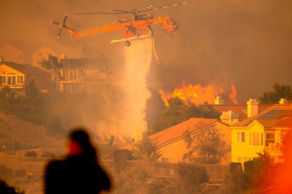 2019年10月11日,加州洛杉矶的波特牧场(Porter Ranch)区发生萨德尔里奇大火(Saddleridge fire),图为一架直升飞机从空中洒水试图扑灭火势。(Josh Edelson/AFP/Getty Images)