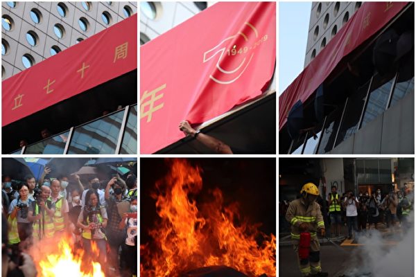 港人上街声讨恶法 焚烧中共贺70年巨型横幅