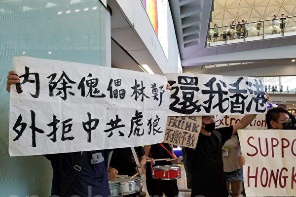 2019年7月26日,一群香港航空界职员在香港机场的接机大厅举行集会抗议《引渡条例》。图为抗议人士以“内除傀儡林郑 外拒中共虎狼”、“还我香港”等横幅表达心声。(宋碧龙/大纪元)