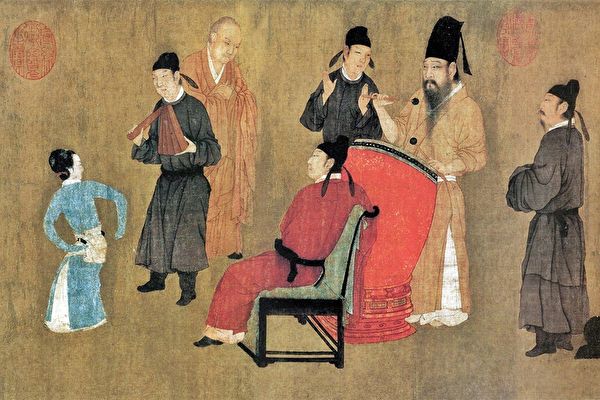 其服饰,唐朝男子主要形式为圆领袍衫,头戴襆头或纱帽、腰束革带、足下乌皮靴为典型装束。襆头以丝绢裁成方巾,方巾四角下垂四长带,用来裹发的头巾,在唐朝非常盛行。上至皇帝,下至庶民,除祭祀典礼之外,平常都穿这种服饰,官员的日常服也是如此。为表示尊重传统,这种圆领衫通常在膝下施加一道横阑,名为阑衫。这种阑衫一直延传至宋代,仍为仕人上服。